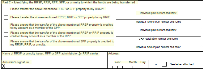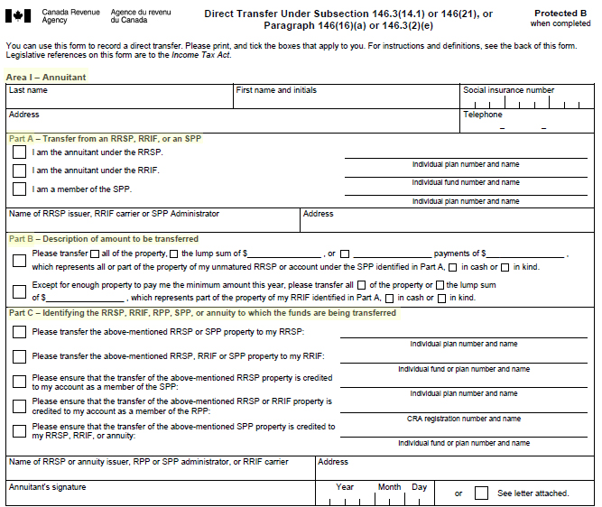 (RRIF), registered pension plan (RPP), or specified pension plan (SPP), you should use this form to directly transfer all or part of the the carrier of the fund, or the issuer of the annuity from whom the property is transferred. If you have questions about this form, visit www.cra.gc ... Fetch Document
